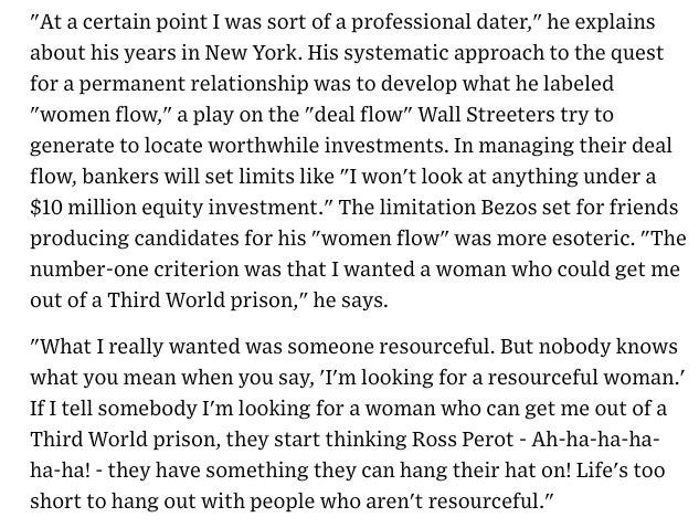 This 1999 Wired profile of Jeff Bezos, in addition to predicting the future of e-commerce with almost alarming prescience, also offers some rather interesting insights into his approach to romance: (ty to loyal reader Rohan N for drawing our attention to this)